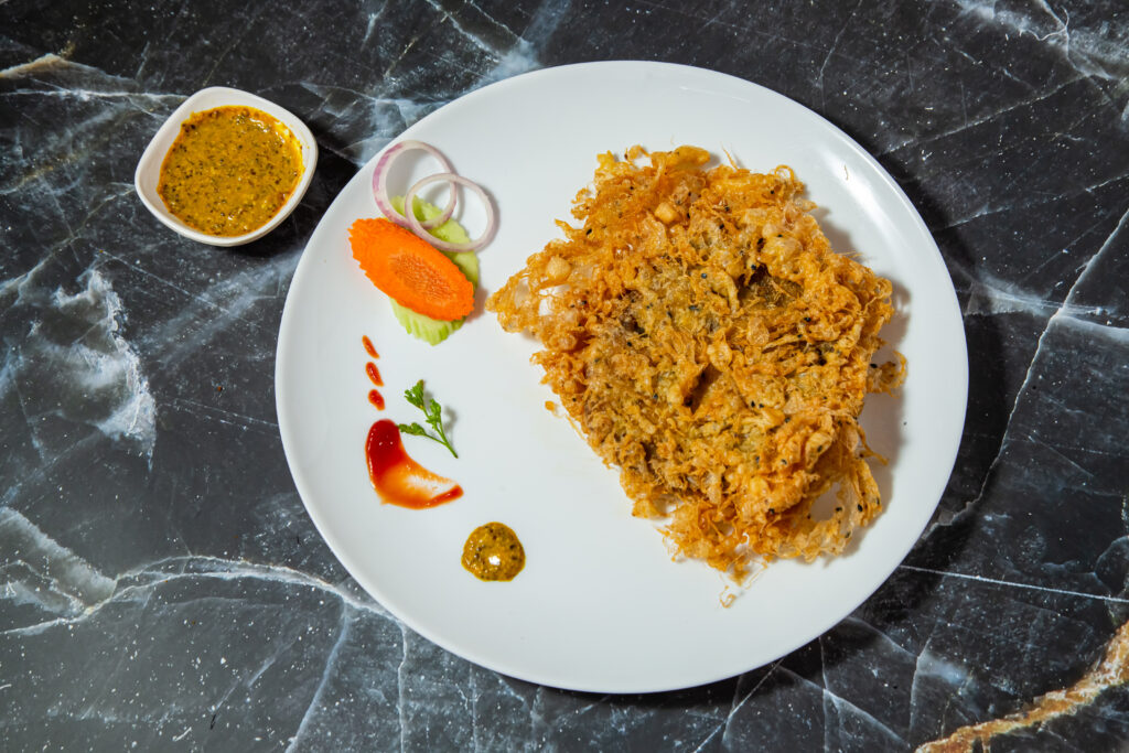 The marinated fish is coated in a batter made from gram flour (besan), which gives it a crispy and golden exterior when fried.
